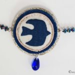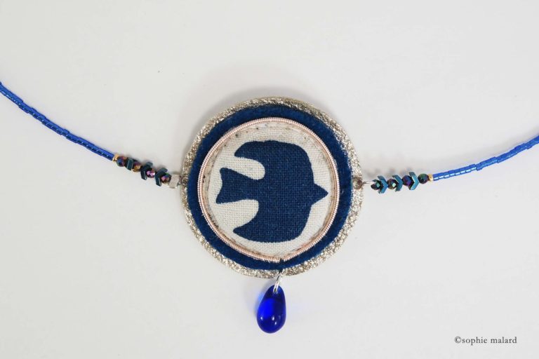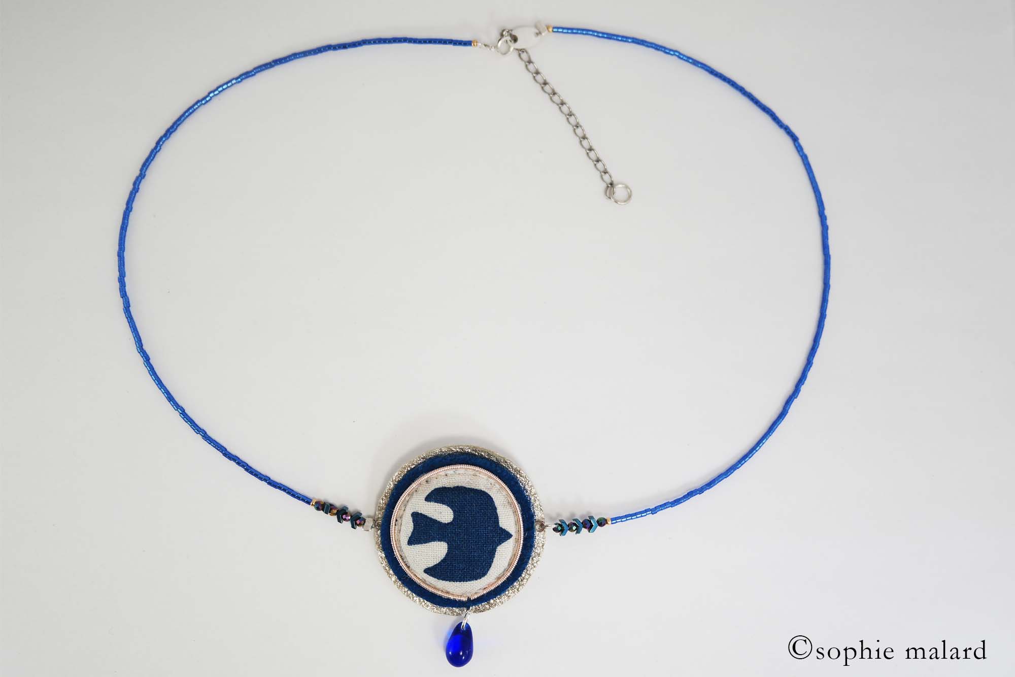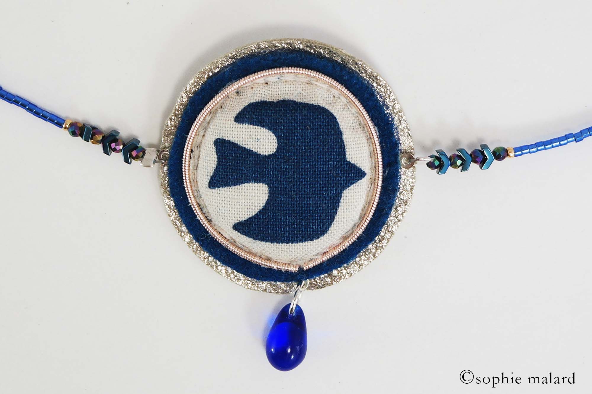 Tissu motif hirondelle, cuir métallisé, feutrine pure laine, tour en jaseron or brodé, tour de cou en perles miyuki et mini perles facettes,goutte en verre, fermoir en argent 925.