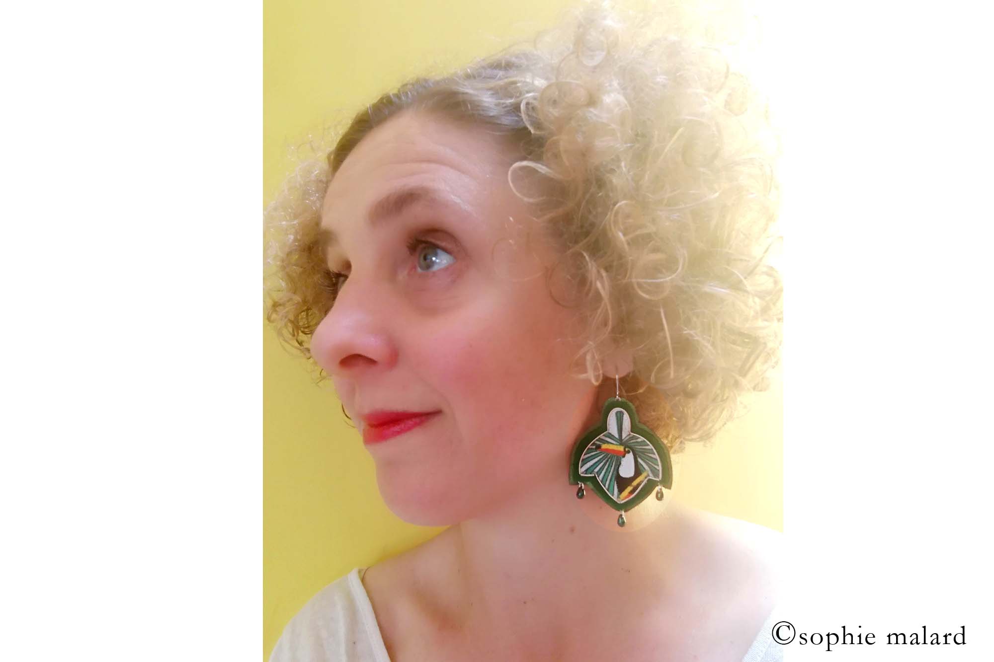 Tissu toucan cousu sur un tissu aux motifs feuilles tropicales, feutrine pure laine, cuir vert métallisé, tour en jaseron or brodé, mini gouttes en verre, fermoirs dormeuses pour oreilles percées en argent véritable 925.