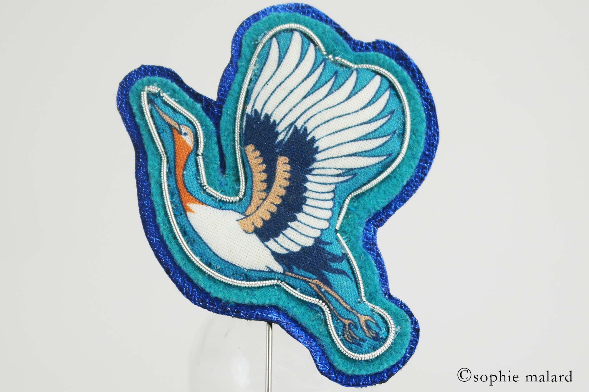 Tissu Japonais motif grue, feutrine pure laine, tour en jaseron argent brodé, fibule en métal argenté.