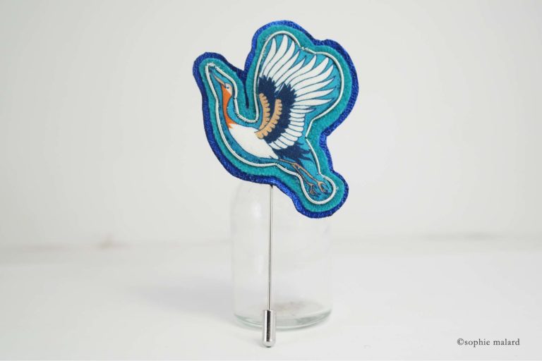 Vous ne passerez pas inaperçue avec cette fibule au style rétro, dont le motif évoque les kimonos traditionnels. La Grue, ou Tsuru, est un animal emblématique de la culture Japonaise. Elle est un symbole de longévité et de bonne fortune.