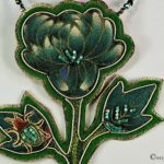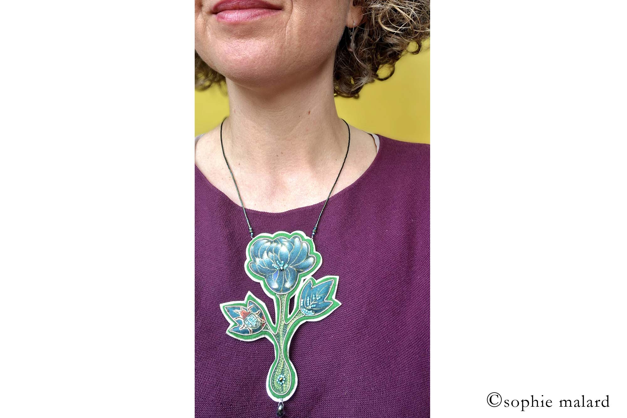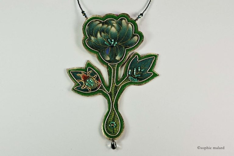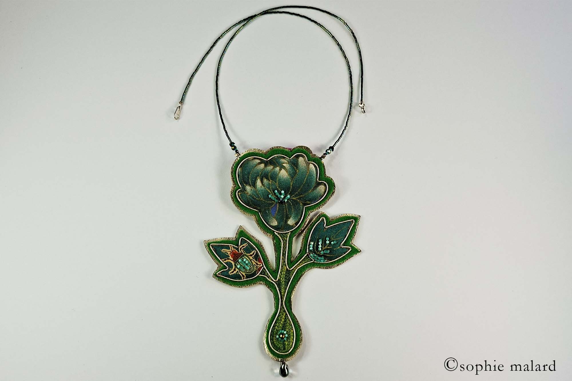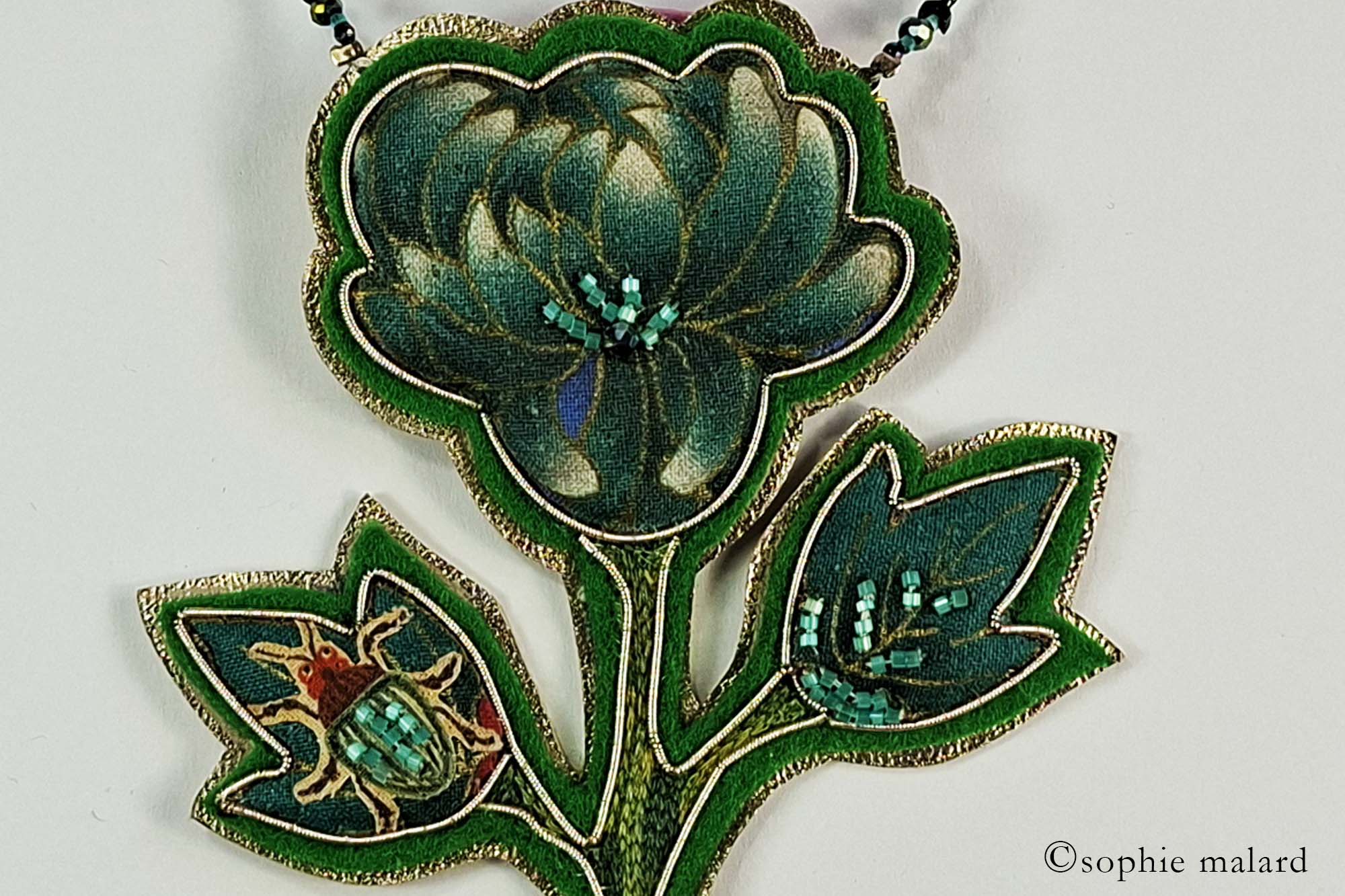 Tissu motif scarabée appliqué sur motif tissu Japonais pivoine, tige pivoine brodée au fil de coton dégradé de verts, feutrine pure laine, cuir, tour en jaseron or brodé, tour de cou en perles facettes de verre et miyuki, goutte en verre, fermoir en argent.