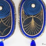 Tissu Japonais aux motifs asymétriques bleu et or, feutrine pure laine, cuir doré métallisé, tour en jaseron or brodé, fil soutache enroulé et cousu à la main (passementerie), gouttes en verre, fermoirs dormeuses pour oreilles percées en argent véritable 925.