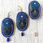 Tissu Japonais motifs bleu et or, feutrine pure laine, cuir doré métallisé, tour en jaseron or brodé, fil soutache enroulé et cousu à la main (passementerie), fibule en métal doré.