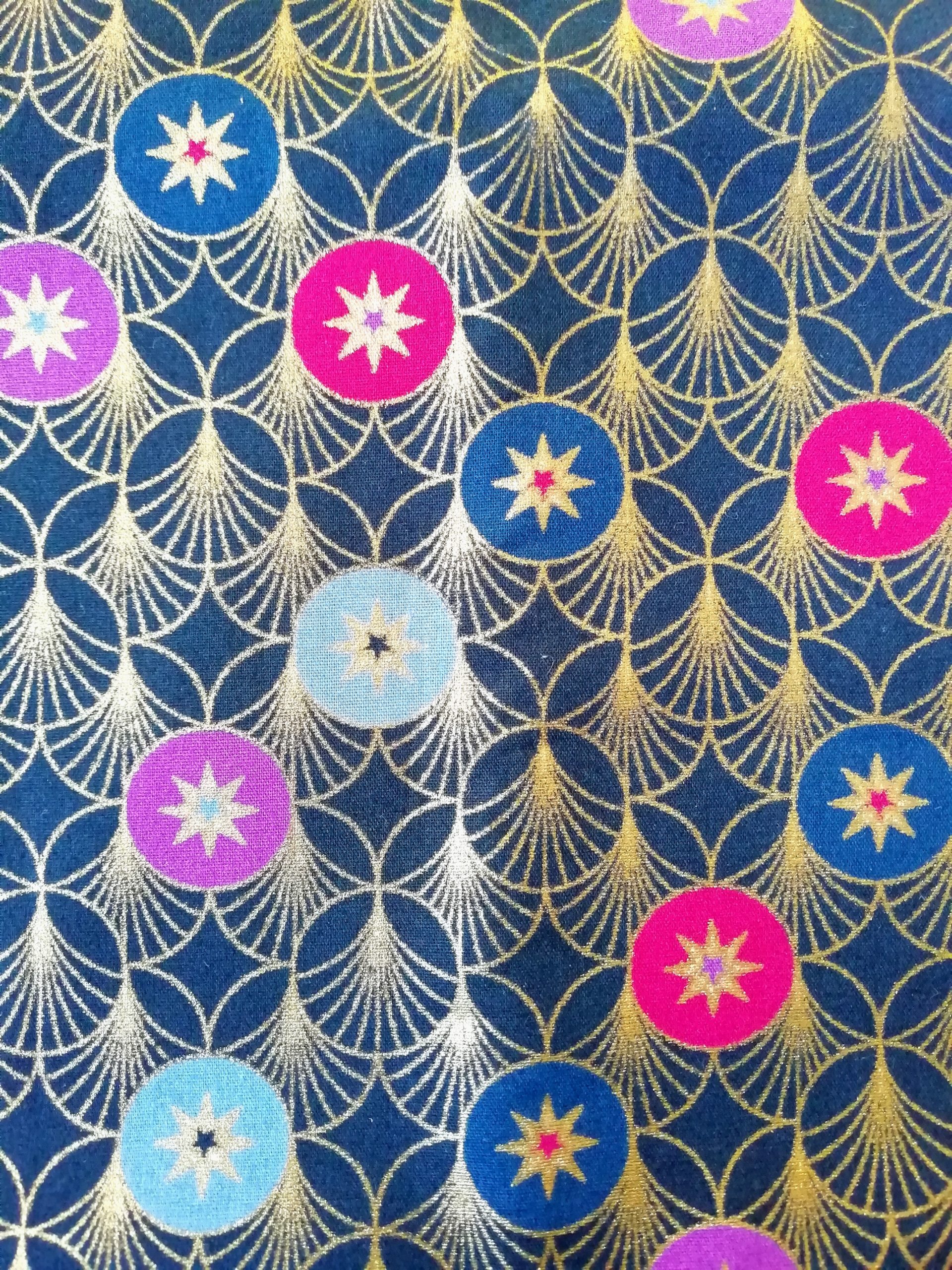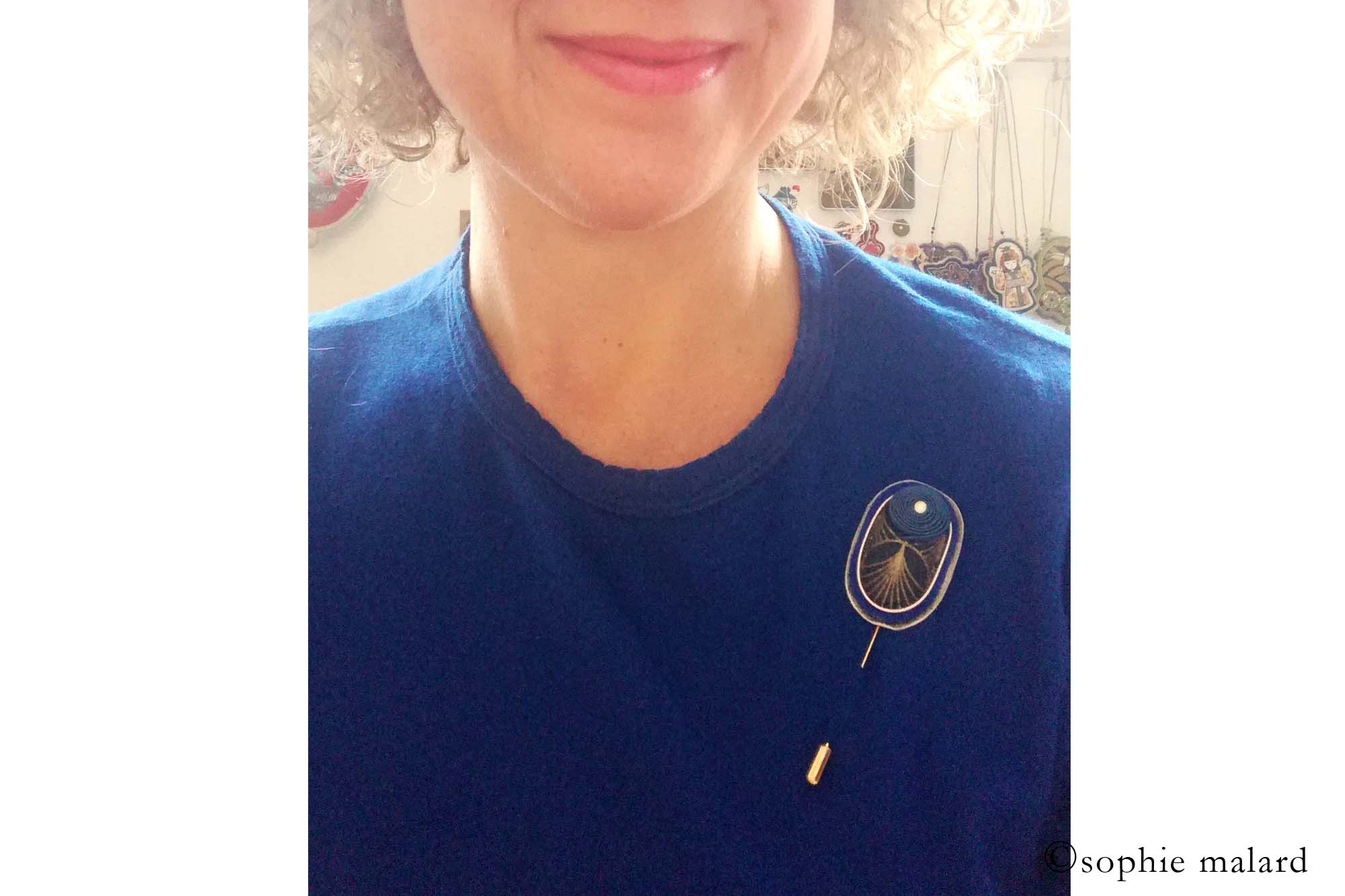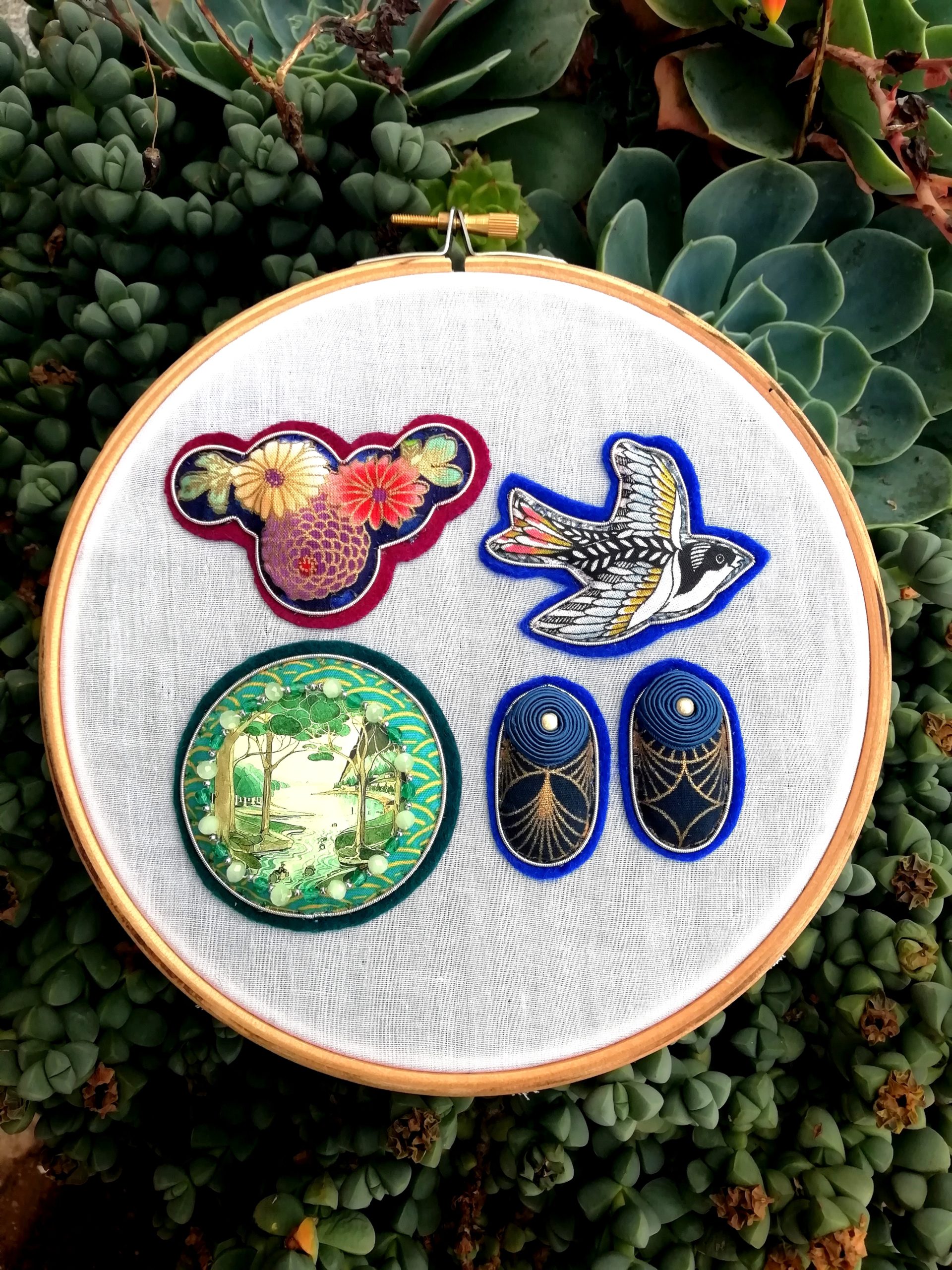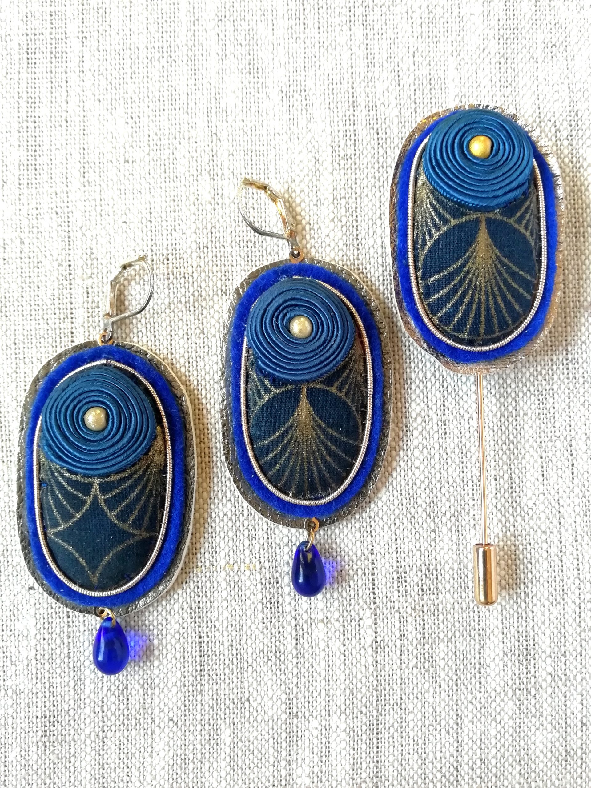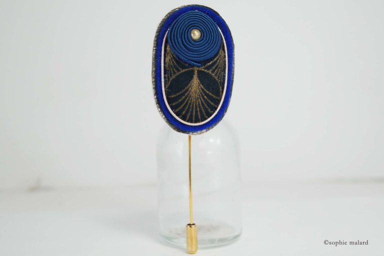 Tissu Japonais motifs bleu et or, feutrine pure laine, cuir doré métallisé, tour en jaseron or brodé, fil soutache enroulé et cousu à la main (passementerie), fibule en métal doré.