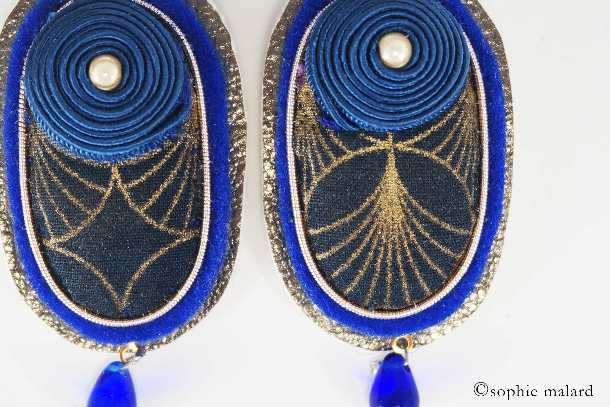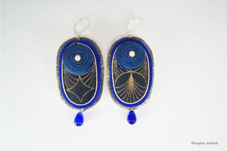 Tissu Japonais aux motifs asymétriques bleu et or, feutrine pure laine, cuir doré métallisé, tour en jaseron or brodé, fil soutache enroulé et cousu à la main (passementerie), gouttes en verre, fermoirs dormeuses pour oreilles percées en argent véritable 925.